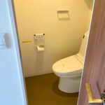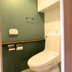 キッチンの天井は木目調のクロス、トイレの壁1面は濃いグリーンのクロスなどイメージにあうものをご提案させて頂きました。