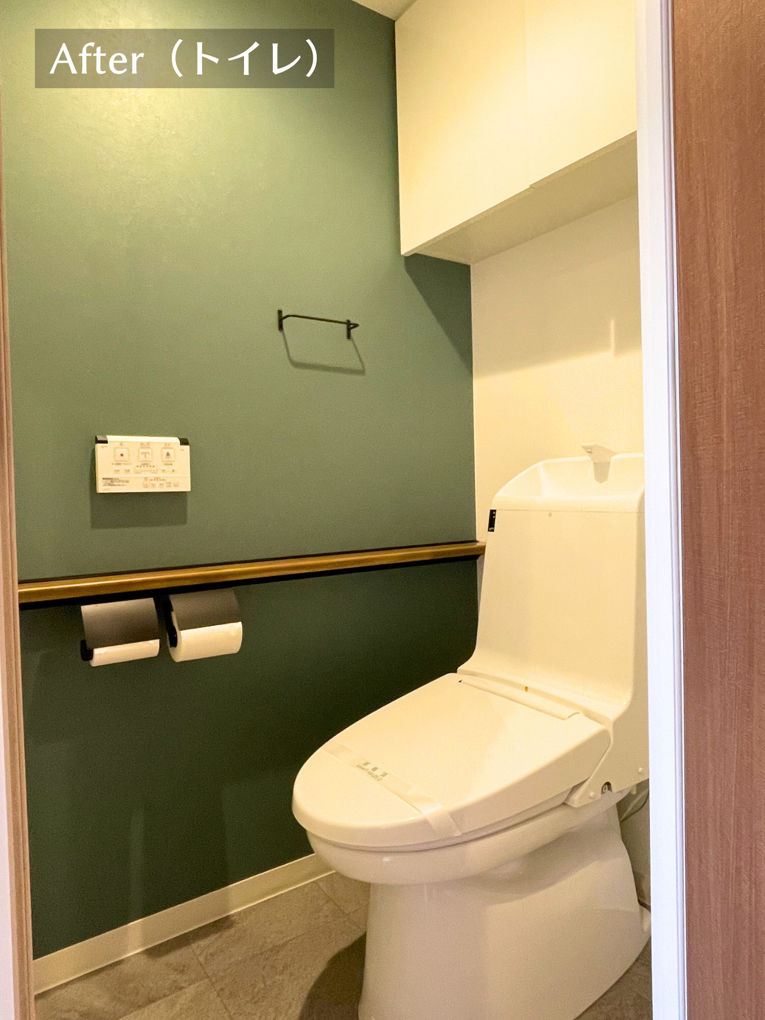 キッチンの天井は木目調のクロス、トイレの壁1面は濃いグリーンのクロスなどイメージにあうものをご提案させて頂きました。