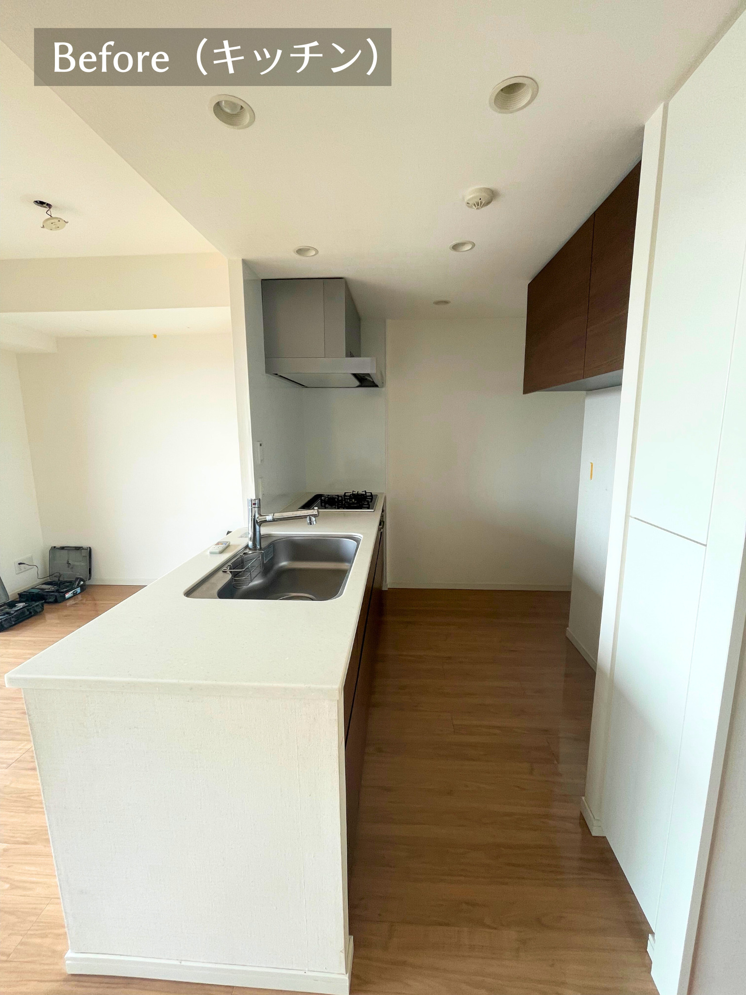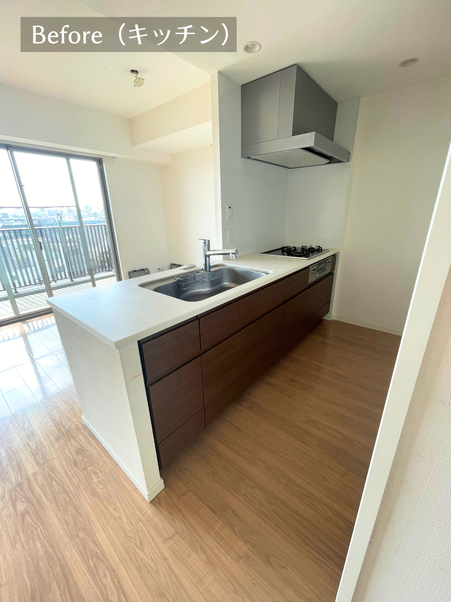 ⑥キッチンの床は既存フローリングの上からフロアタイル(塩ビタイル)を貼りました。