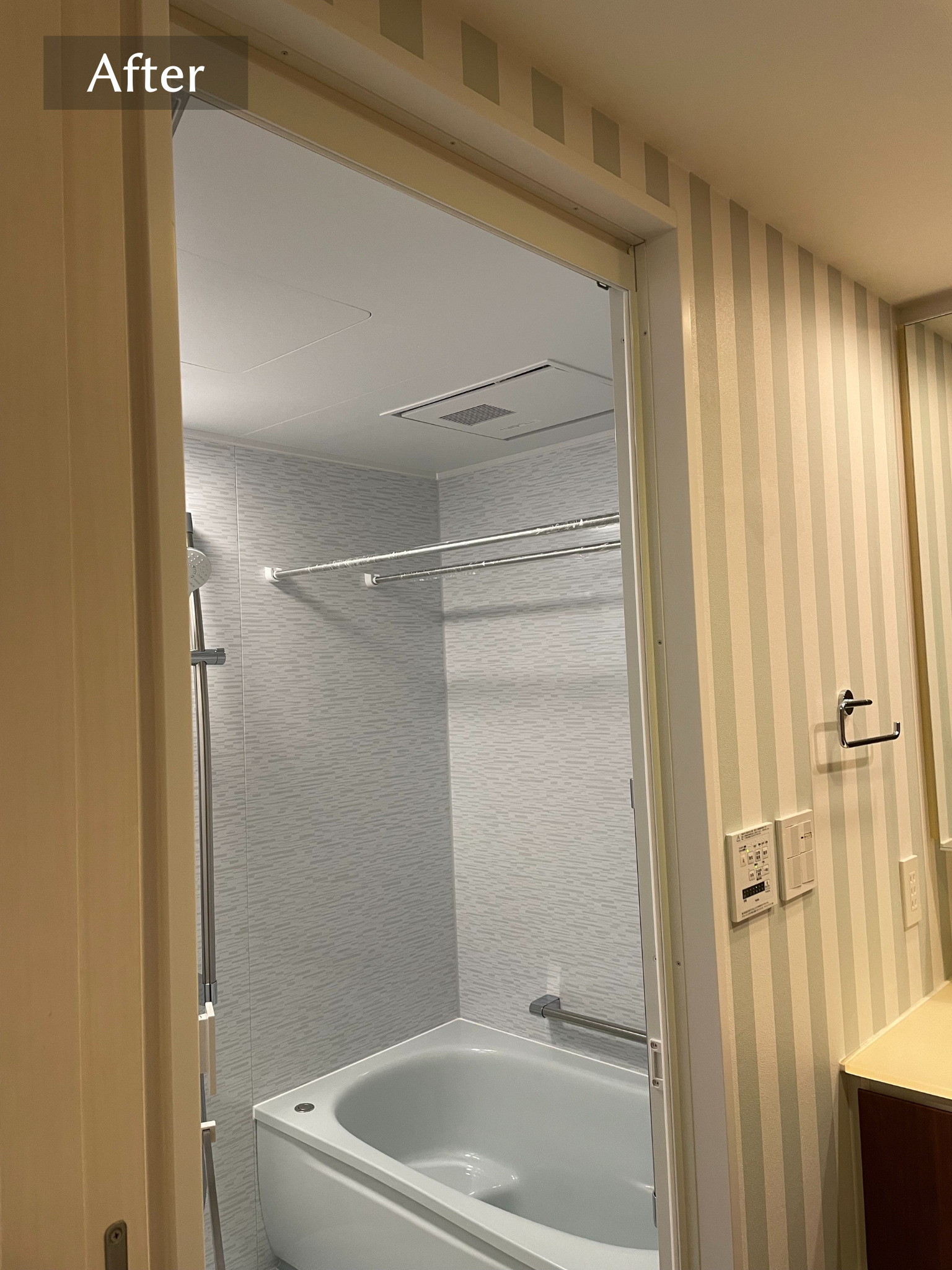 ユニットバス内の壁、浴槽がブルー系なので、ブルーとホワイトのストライプを選びました。