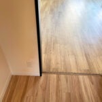 違う床材なので継ぎ目には見切りが必要で似たような色柄にしたことで、どちらにも合う色の見切りを選びました。